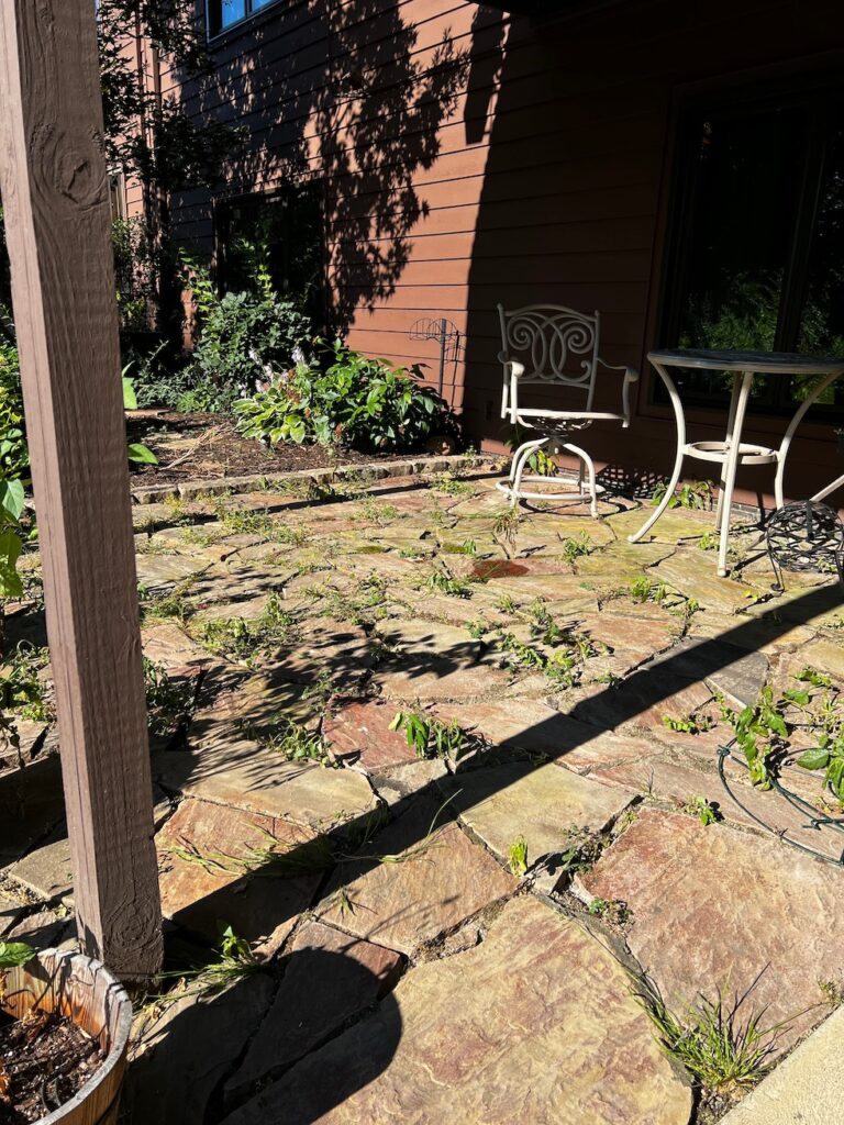 The patio looked lovely at first, but sadly, the stone setting never stayed in place; it washed out after each rain, leaving gaps between the stones. Every few weeks those gaps filled with weeds, requiring me to pull or spray them. I had to replace the fill three times at a cost of over $1,000 for time, supplies, and labor.